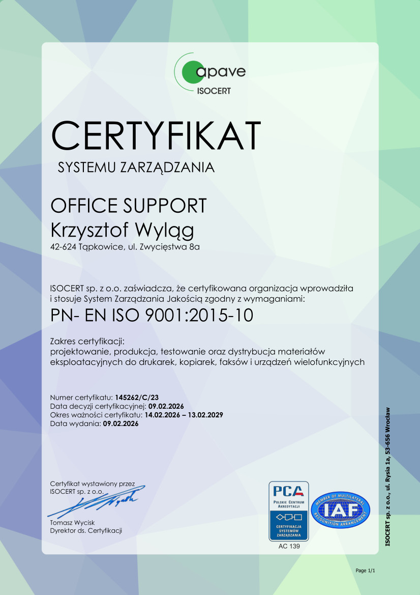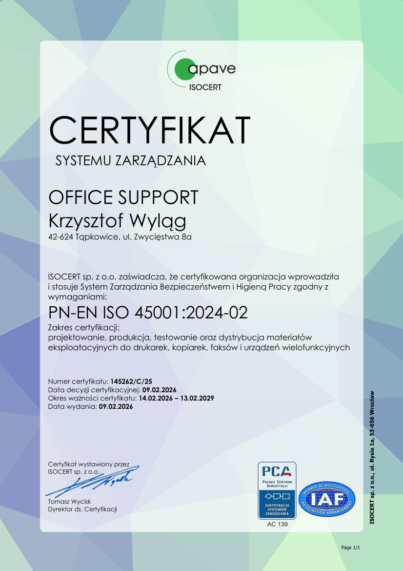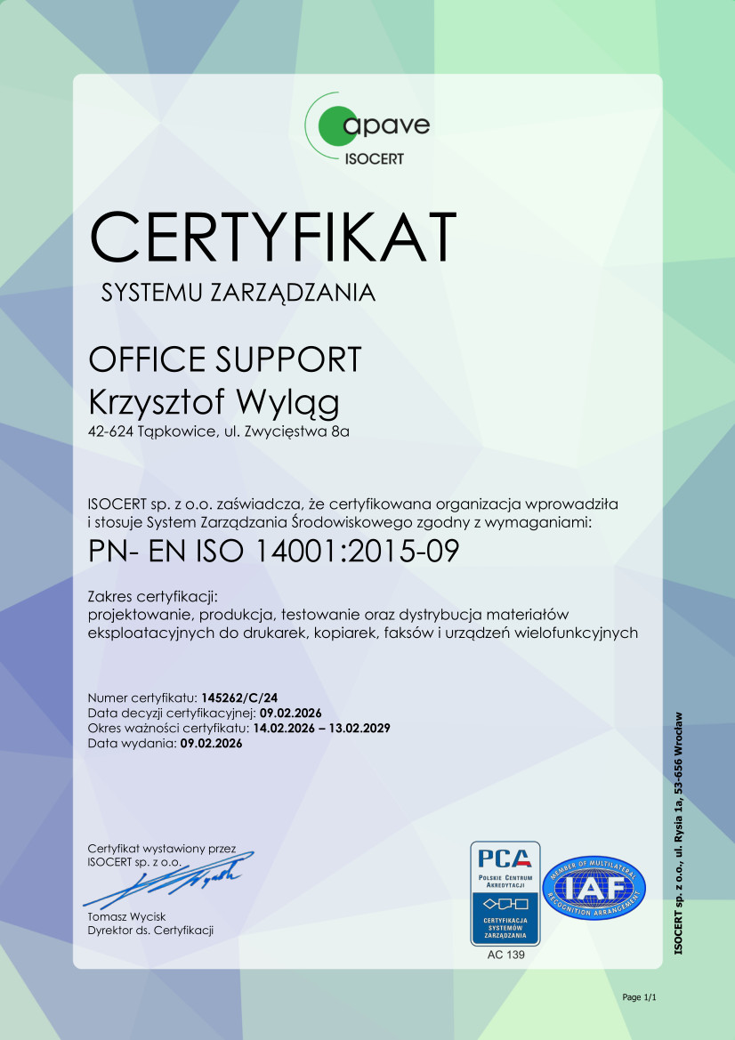 - Certyfikat Złota 7 w kat. tusze i tonery